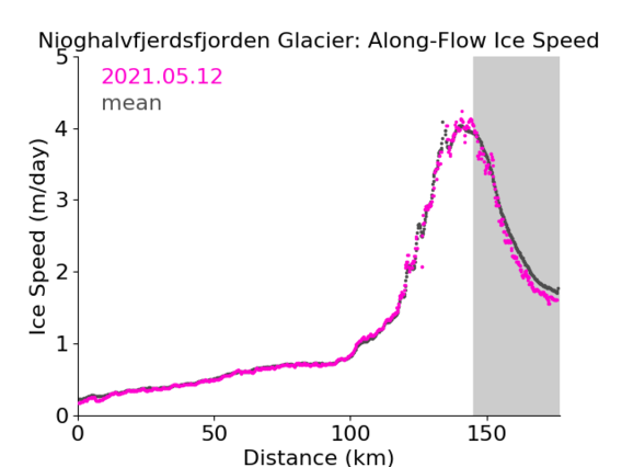 Click on the map to select a glacier and show maps and charts of the ice velocity data we have processed so far. Grey shading on the plots is used to indicate the floating part of the glacier.