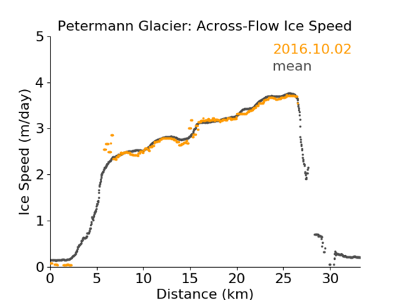 Click on the map to select a glacier and show maps and charts of the ice velocity data we have processed so far. Grey shading on the plots is used to indicate the floating part of the glacier.