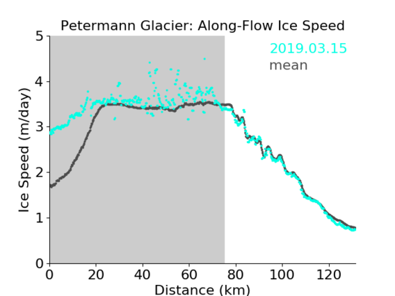 Click on the map to select a glacier and show maps and charts of the ice velocity data we have processed so far. Grey shading on the plots is used to indicate the floating part of the glacier.