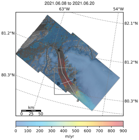 Ice velocity map of the extracted region on Petermann Glacier, from Sentinel-1 data acquired between 08.06.2021 - 20.06.2021 Geotiff 0.52 MB coffsN_mag_DuFil_yrF.gc_extract.tiff