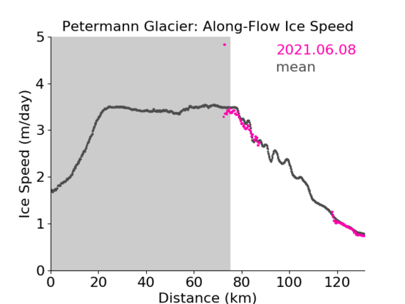 Click on the map to select a glacier and show maps and charts of the ice velocity data we have processed so far. Grey shading on the plots is used to indicate the floating part of the glacier.