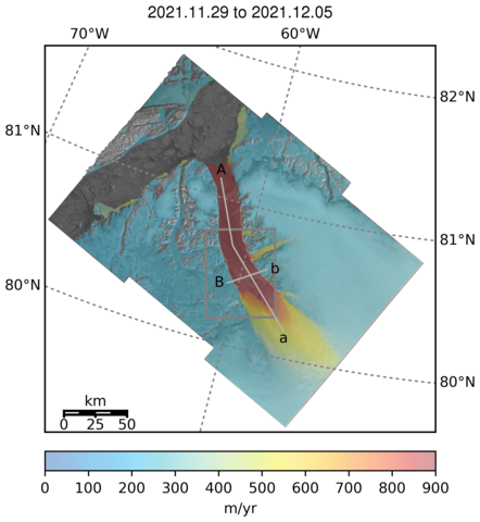 Ice velocity map of the extracted region on Petermann Glacier, from Sentinel-1 data acquired between 29.11.2021 - 05.12.2021 Geotiff 0.52 MB coffsN_mag_DuFil_yrF.gc_extract.tiff