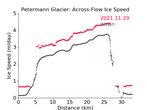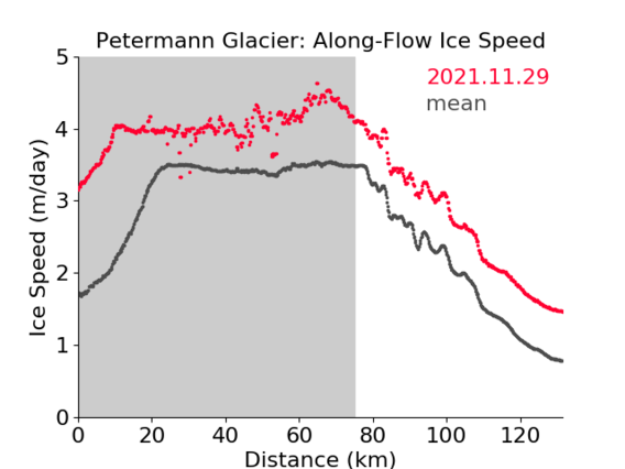 Click on the map to select a glacier and show maps and charts of the ice velocity data we have processed so far. Grey shading on the plots is used to indicate the floating part of the glacier.
