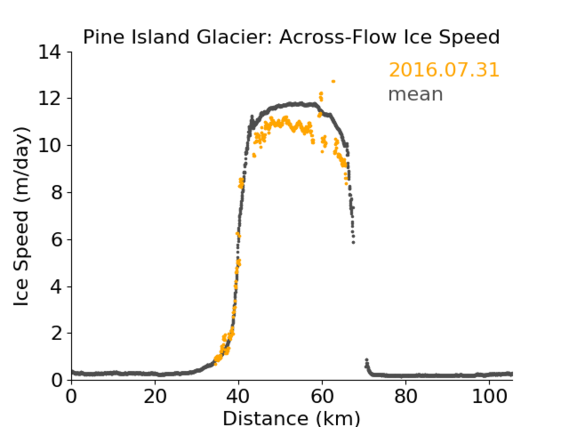 Click on the map to select a glacier and show maps and charts of the ice velocity data we have processed so far. Grey shading on the plots is used to indicate the floating part of the glacier.