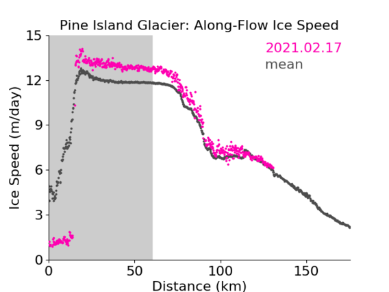 Click on the map to select a glacier and show maps and charts of the ice velocity data we have processed so far. Grey shading on the plots is used to indicate the floating part of the glacier.