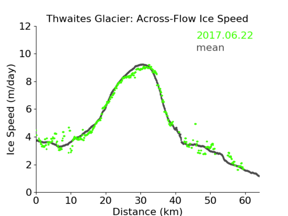 Click on the map to select a glacier and show maps and charts of the ice velocity data we have processed so far. Grey shading on the plots is used to indicate the floating part of the glacier.