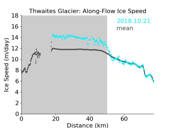 Click on the map to select a glacier and show maps and charts of the ice velocity data we have processed so far. Grey shading on the plots is used to indicate the floating part of the glacier.