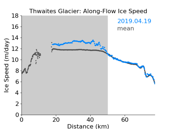 Click on the map to select a glacier and show maps and charts of the ice velocity data we have processed so far. Grey shading on the plots is used to indicate the floating part of the glacier.