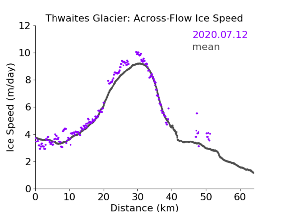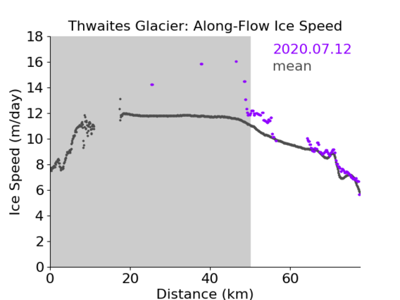 Click on the map to select a glacier and show maps and charts of the ice velocity data we have processed so far. Grey shading on the plots is used to indicate the floating part of the glacier.