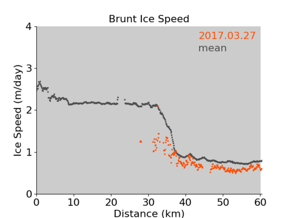 Click on the map to select a glacier and show maps and charts of the ice velocity data we have processed so far. Grey shading on the plots is used to indicate the floating part of the glacier.