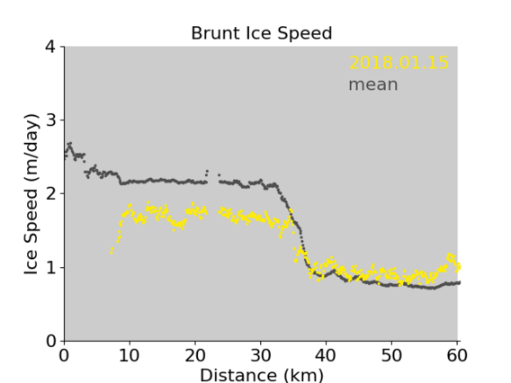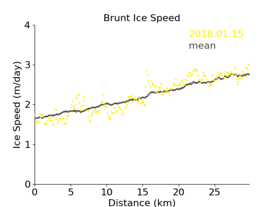 Click on the map to select a glacier and show maps and charts of the ice velocity data we have processed so far. Grey shading on the plots is used to indicate the floating part of the glacier.