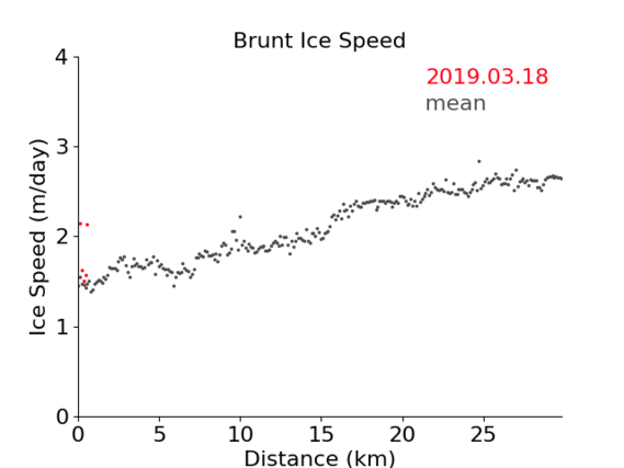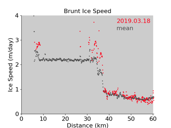 Click on the map to select a glacier and show maps and charts of the ice velocity data we have processed so far. Grey shading on the plots is used to indicate the floating part of the glacier.