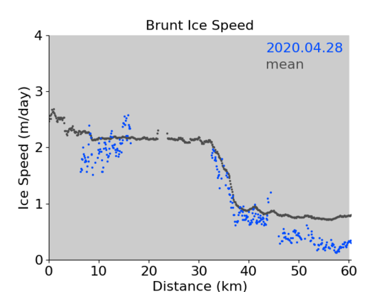 Click on the map to select a glacier and show maps and charts of the ice velocity data we have processed so far. Grey shading on the plots is used to indicate the floating part of the glacier.