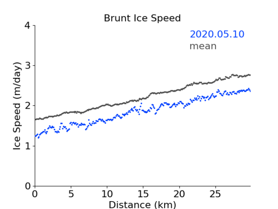 Click on the map to select a glacier and show maps and charts of the ice velocity data we have processed so far. Grey shading on the plots is used to indicate the floating part of the glacier.
