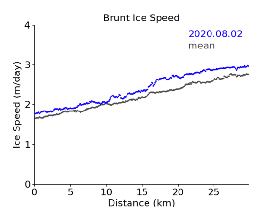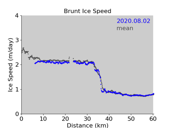 Click on the map to select a glacier and show maps and charts of the ice velocity data we have processed so far. Grey shading on the plots is used to indicate the floating part of the glacier.