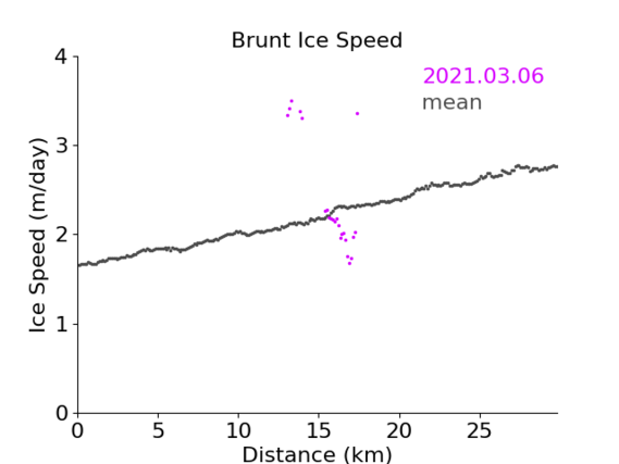 Ice velocity map of the extracted region on Brunt Ice Shelf, from Sentinel-1 data acquired between 06.03.2021 - 12.03.2021 Geotiff 2.62 MB coffsN_mag_DuFil_yrF.gc_extract.tiff