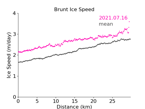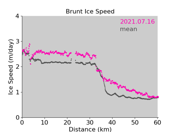 Click on the map to select a glacier and show maps and charts of the ice velocity data we have processed so far. Grey shading on the plots is used to indicate the floating part of the glacier.